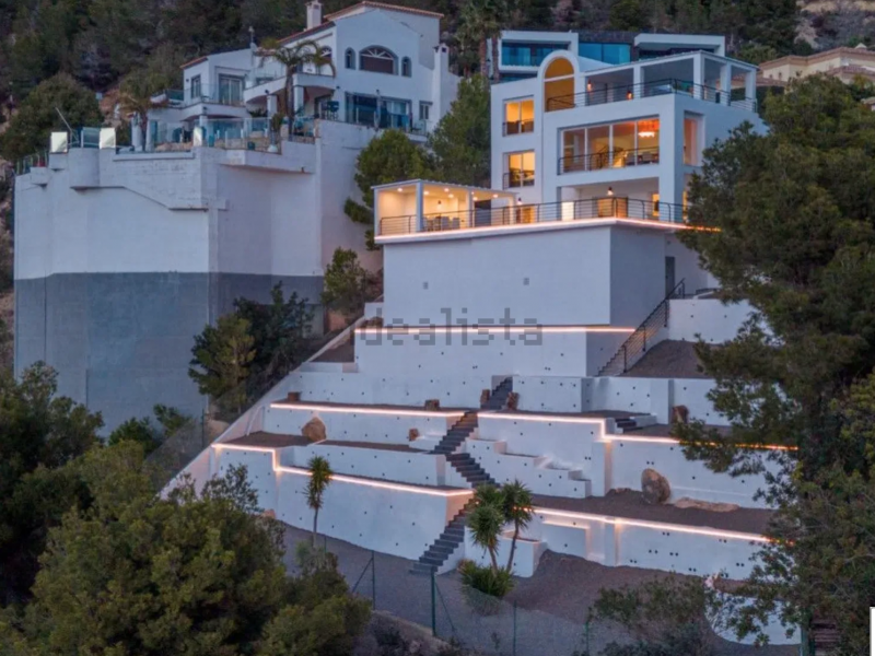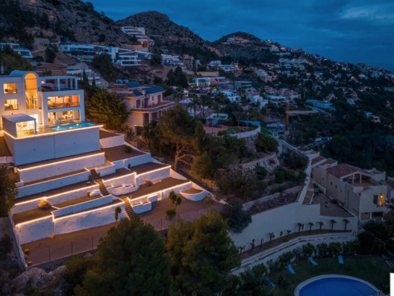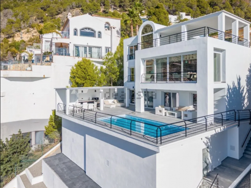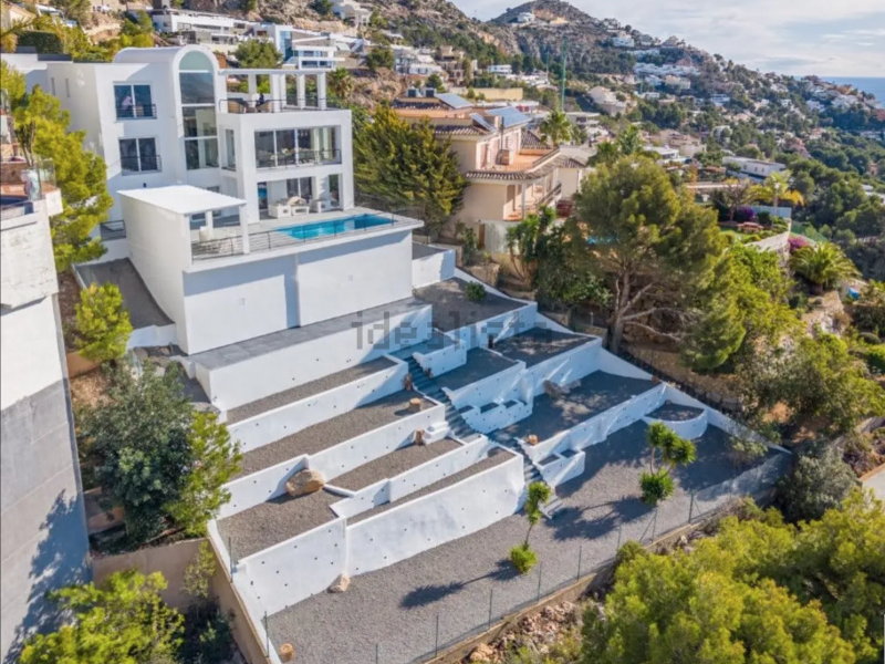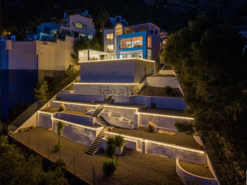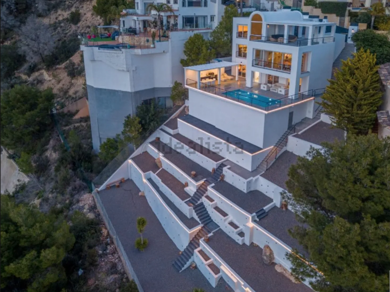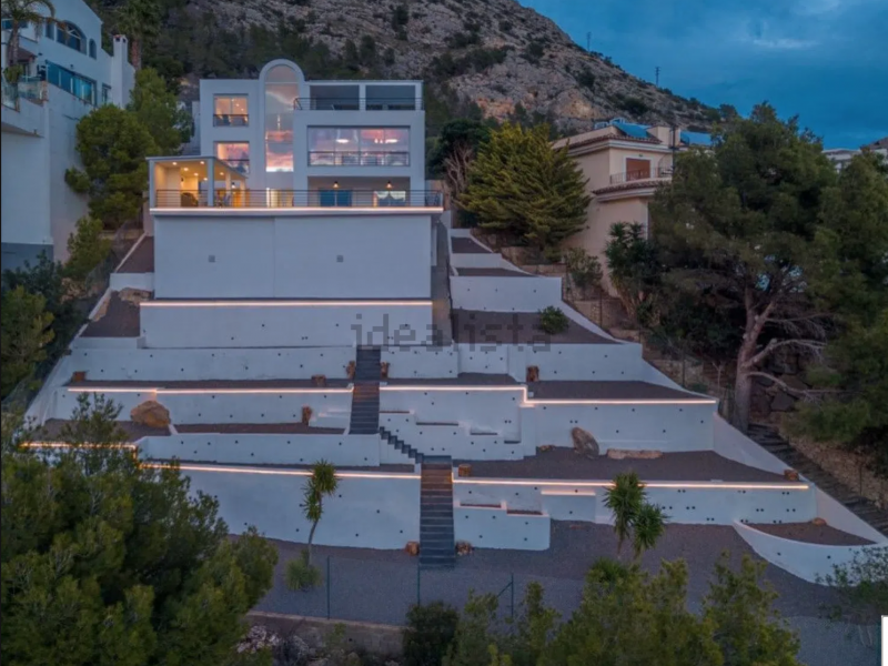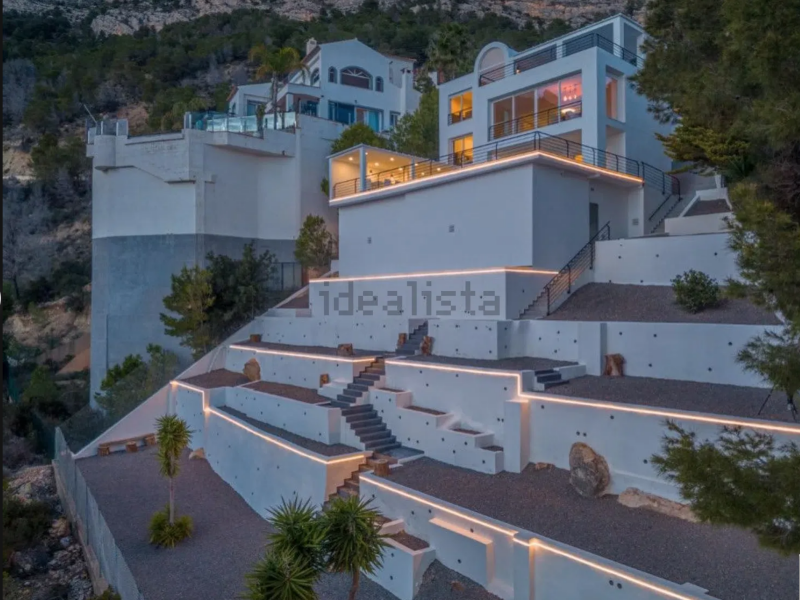 Het privézwembad opent zich naar het landschap en biedt een unieke omgeving om te genieten van het uitzicht op de zee en de kust. Overdag zijn er spectaculaire panorama's te bewonderen en 's nachts creëert de verlichte baai van Altea een magische en exclusieve sfeer. Verschillende terrassen omringen het huis en bieden hoekjes voor ontspanning of entertainment.