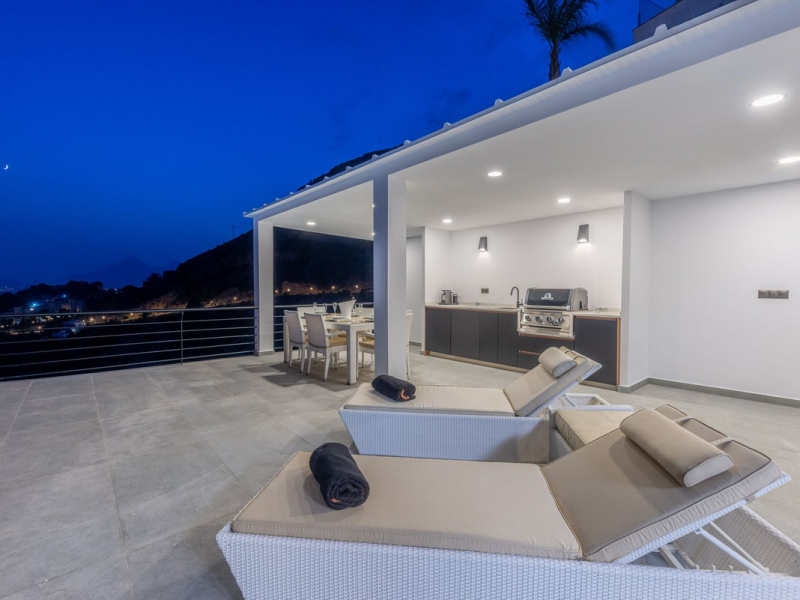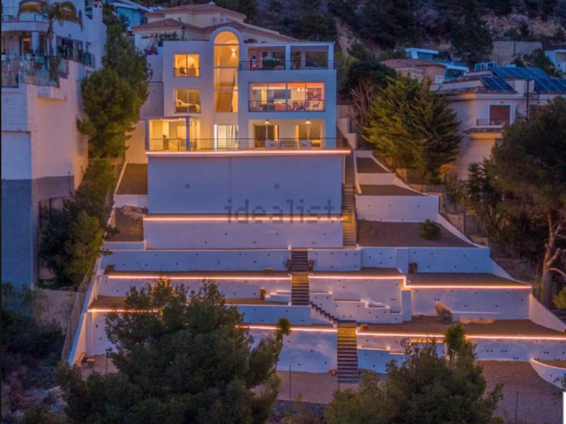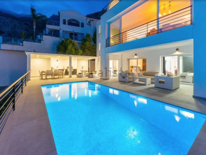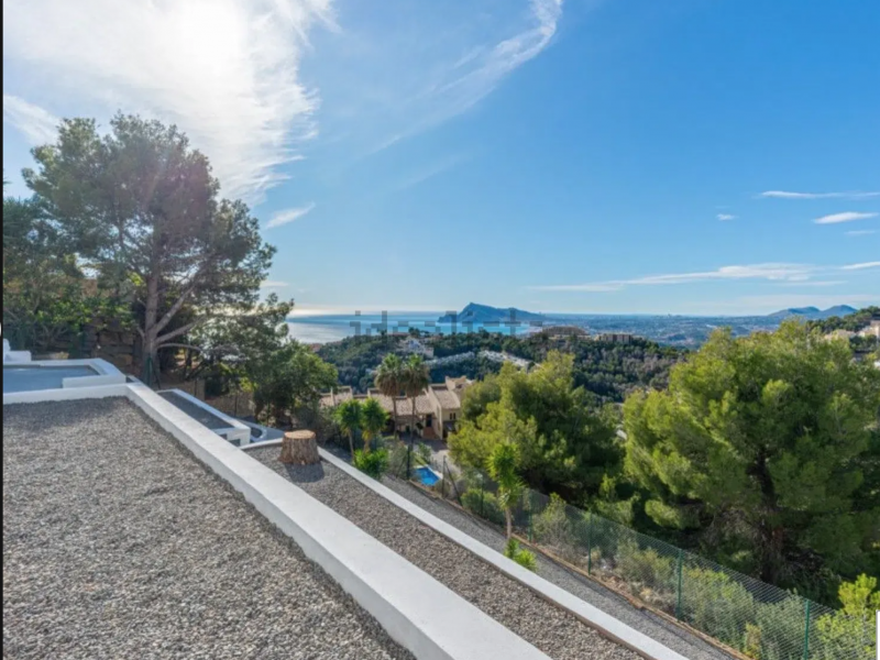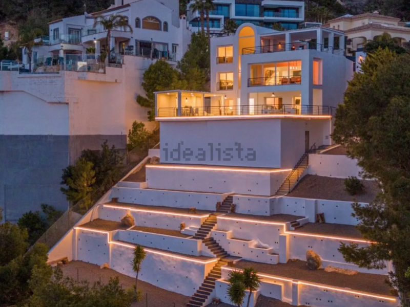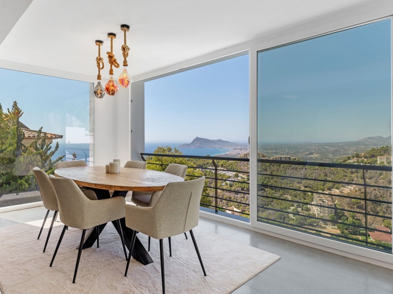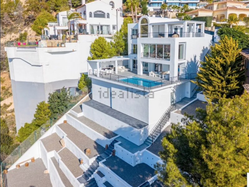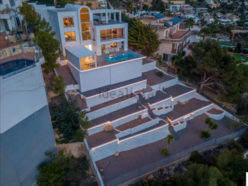 Het privézwembad opent zich naar het landschap en biedt een unieke omgeving om te genieten van het uitzicht op de zee en de kust. Overdag zijn er spectaculaire panorama's te bewonderen en 's nachts creëert de verlichte baai van Altea een magische en exclusieve sfeer. Verschillende terrassen omringen het huis en bieden hoekjes voor ontspanning of entertainment.