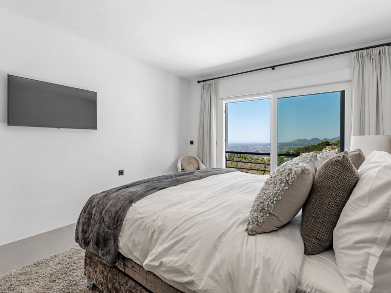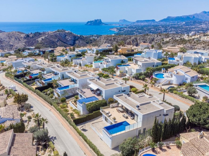 Contemporary and opulent, this four-bedroom, five-bathroom villa in Calpe boasts extraordinary sea views, offering a harmonious blend of modern aesthetics and luxurious living.